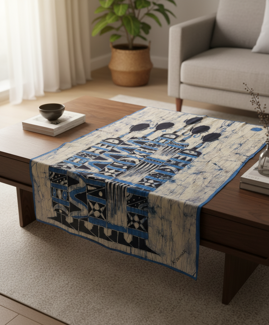 Ce tableau en batik célèbre l'unité et l'harmonie familiale. Représentant une famille de 5 personnes unie dans une même verticalité, il évoque la protection, la transmission et les liens indéfectibles qui unissent parents et enfants.