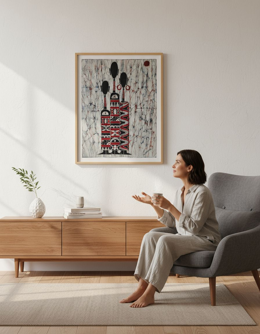 Offrez-vous ce batik "trio d'amour" qui représente un père, une mère et leur enfant, unis dans une même verticalité, symbole de protection, de tendresse et de transmission. À travers ses motifs traditionnels et ses couleurs vibrantes, l'œuvre célèbre la beauté du lien familial et l'harmonie des cœurs.
