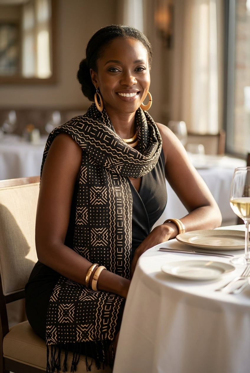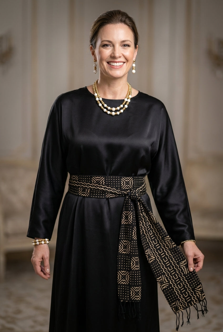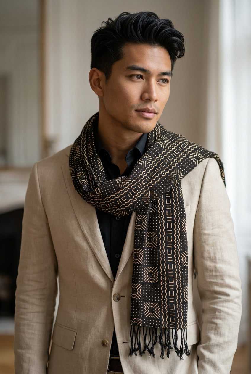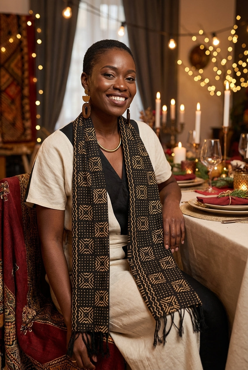 Apportez une touche d’authenticité et de caractère à votre style ou à votre intérieur avec cette écharpe en bogolan traditionnel, réalisée à la main selon un savoir-faire ancestral d’Afrique de l’Ouest.