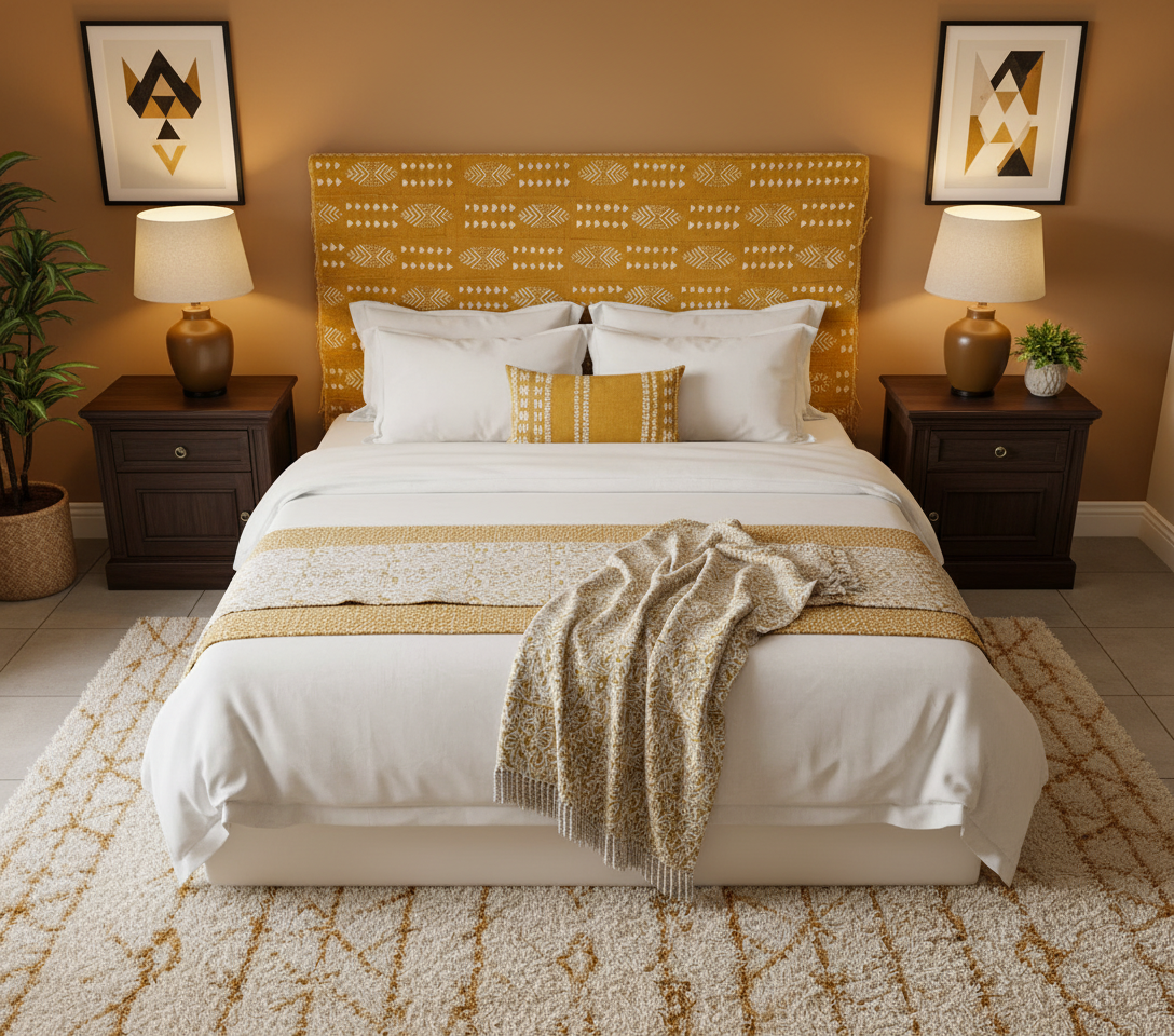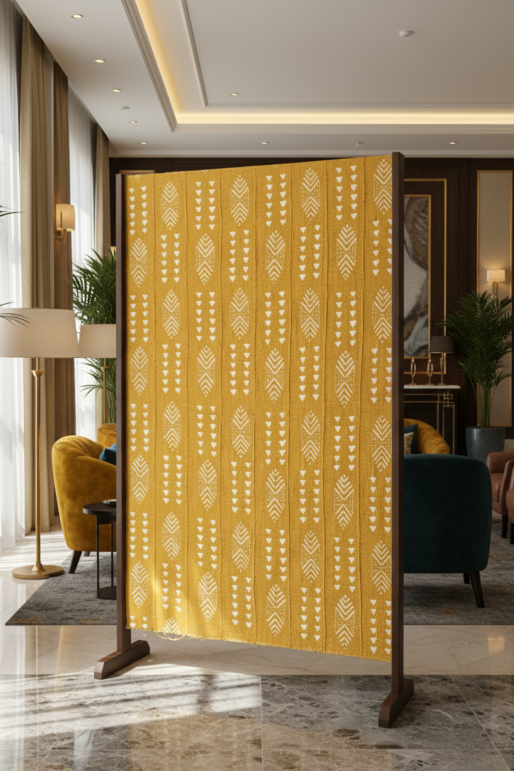 Plus qu’une étoffe, ce bogolan de couleurs moutarde et blanc est une œuvre textile unique, porteuse d’histoire, de savoir-faire et de sens.