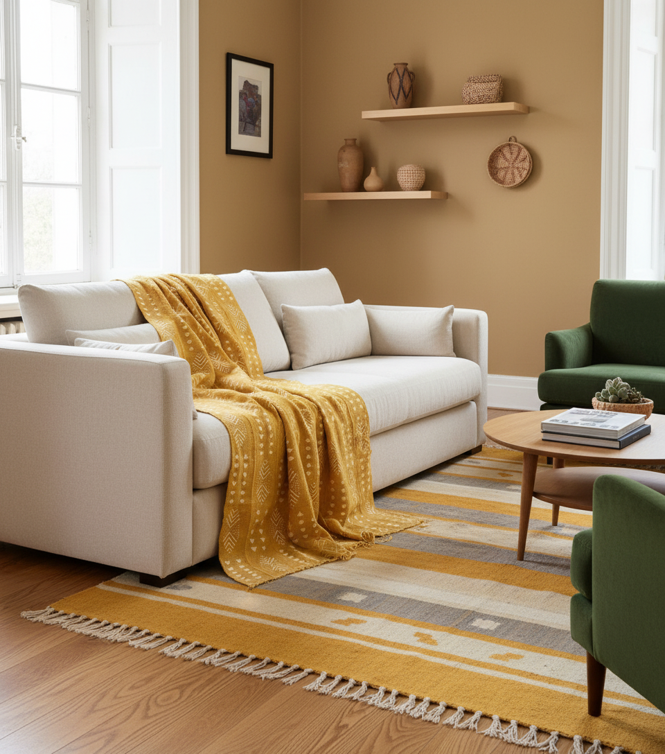 Ses teintes profondes et naturelles, obtenues par teinture végétale et minérale, confèrent à chaque intérieur une atmosphère chaleureuse, authentique et contemporaine, tout en rendant hommage aux traditions textiles du Mali.