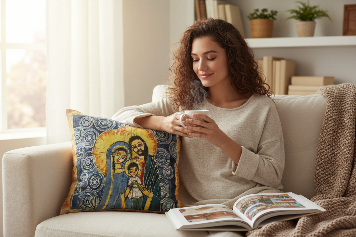 Avec son style expressif et ses couleurs vibrantes, cette œuvre textile représente la Sainte Famille, rayonnante de tendresse et de paix. Un véritable tableau d’inspiration spirituelle… à poser sur un canapé, un fauteuil ou dans votre coin prière.