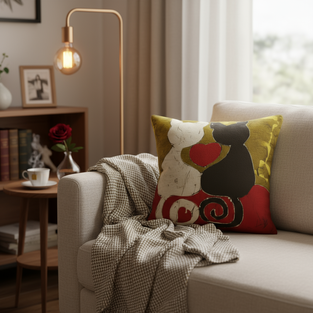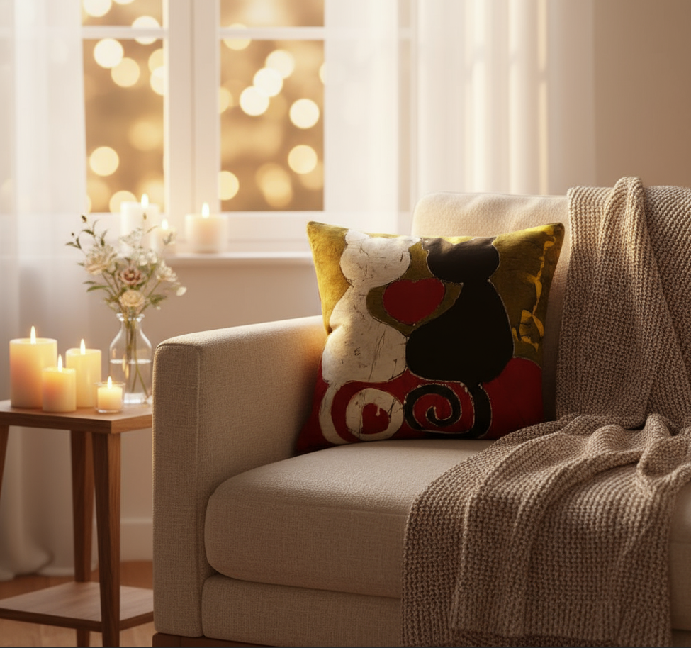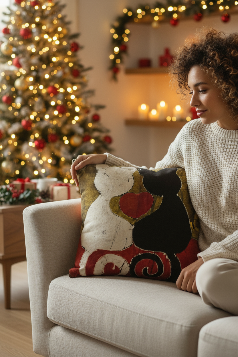 Cette housse en batik apporte une touche de gaieté et d'humour à votre intérieur. Parfaite pour les amoureux des chats, elle trouve sa place dans un salon familial, une chambre romantique ou un espace de détente. Utilisez-la comme housse de coussin pour votre canapé, comme tableau décoratif mural pour égayer un mur, comme sac de rangement original ou comme parure d'abat-jour pour une lampe unique. Cadeau de Noël original pour les passionnés de chats, pour la Saint-Valentin ou pour apporter une note ludique et tendre à votre décoration.