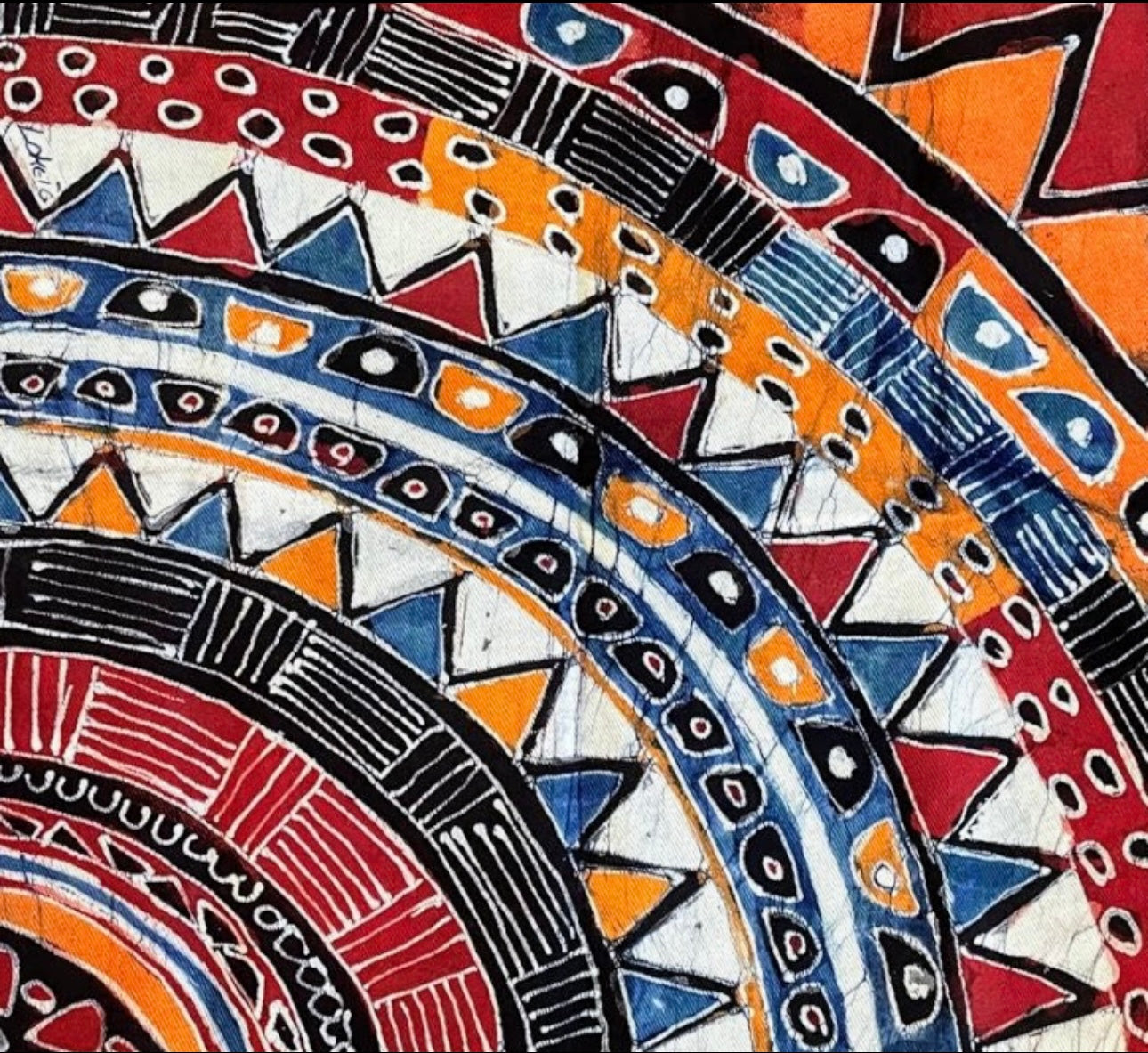 Ce batik est réalisé sur une base textile appelée Tapotin, une matière développée au sein de Sol’Anna : un coton brut transformé en support artistique, teint et retravaillé à la main.