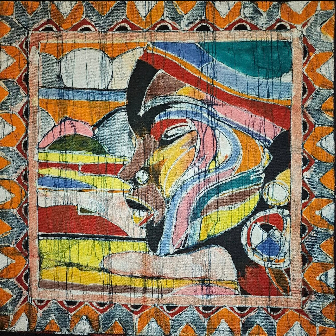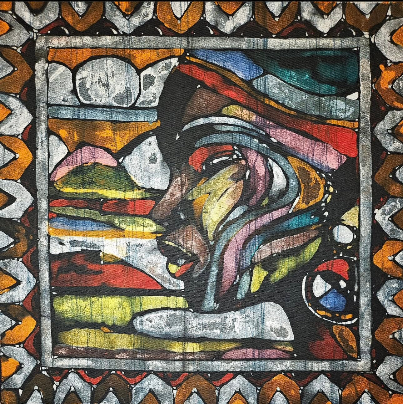 Ce batik est réalisé sur une base textile appelée Tapotin, une matière développée au sein de Sol’Anna : un coton brut transformé en support artistique, teint et retravaillé à la main.