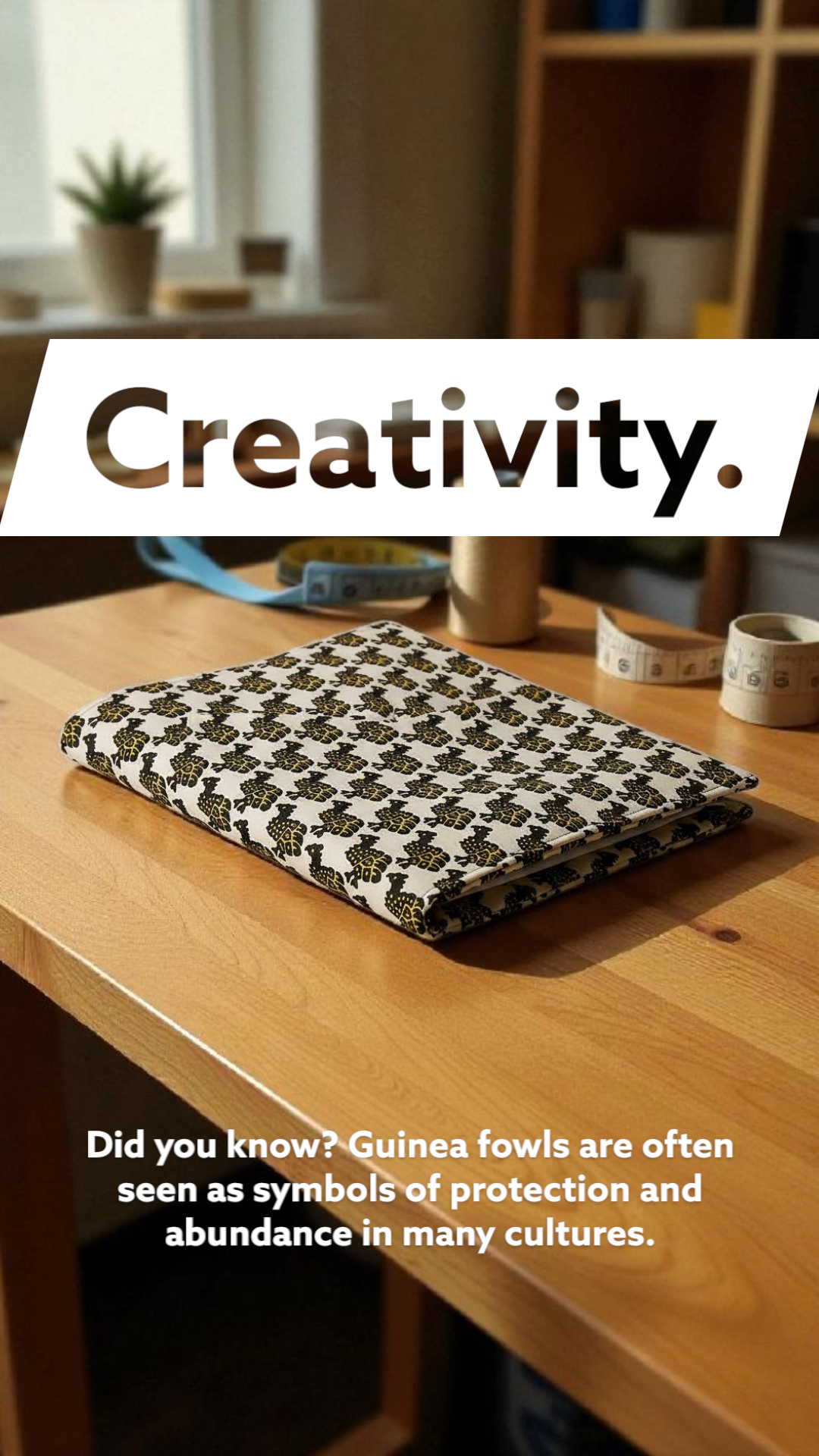 Ce protège-cahier en pagne wax 100 % coton, orné de fières pintades, allie élégance et durabilité.